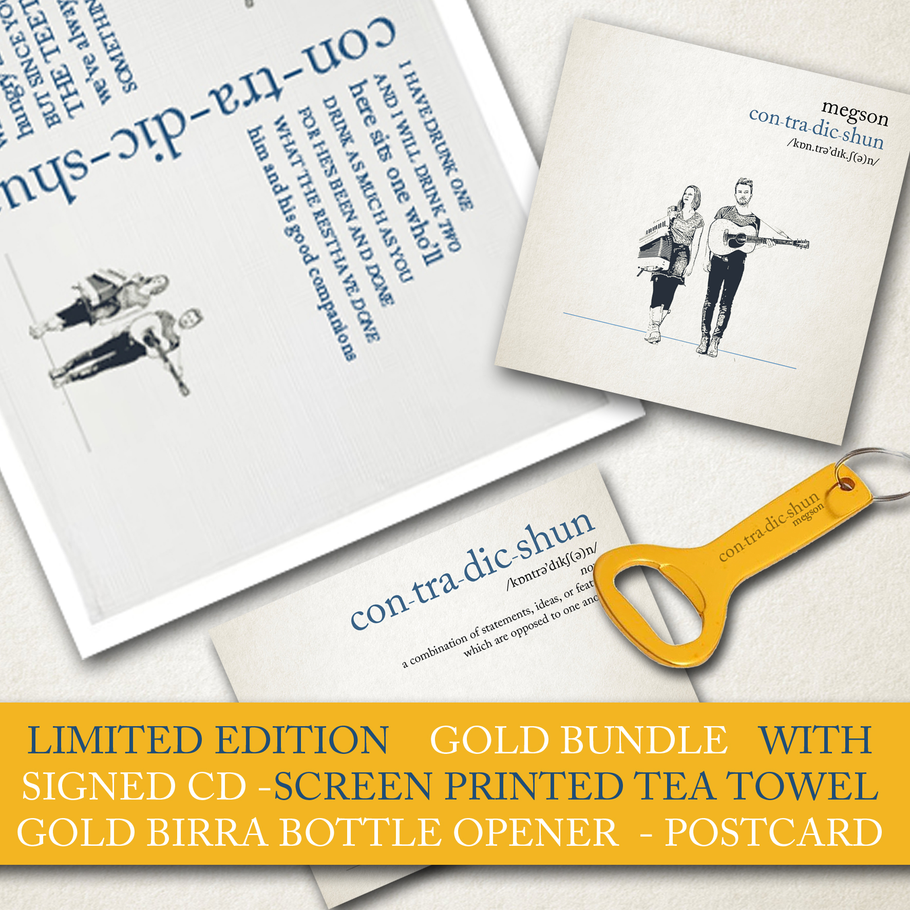 SIGNED CON-TRA-DIC-SHUN CD – CON-TRA-DIC-SHUN DESIGNER TEA TOWEL – CON-TRA-DIC-SHUN POSTCARD – CON-TRA-DIC-SHUN BIRRA BOTTLE OPENER